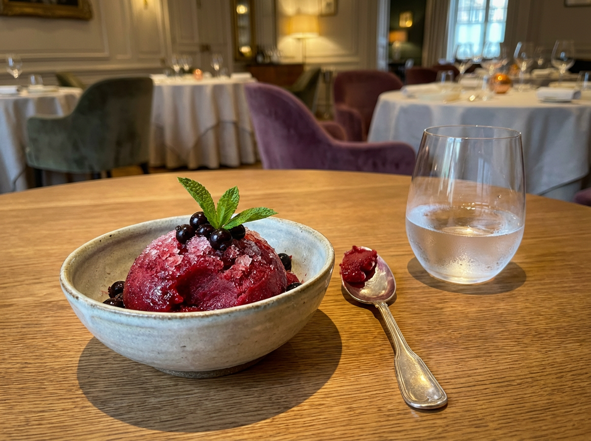 Vivacité structurée, profondeur aromatique, finale légèrement tannique. Un sorbet vibrant, presque vineux, d’une puissance remarquable.