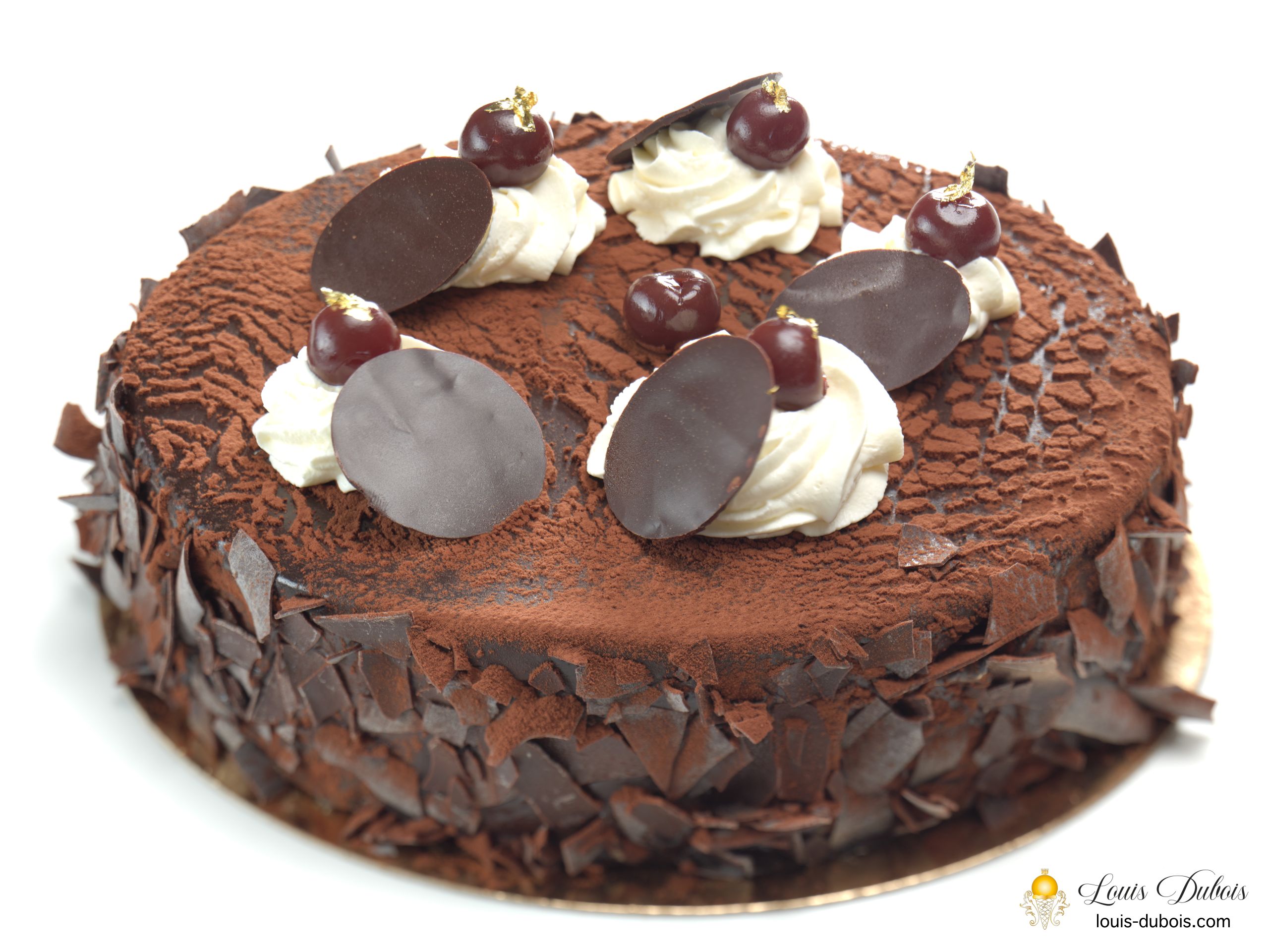 Double biscuit chocolat, mousse vanille au kirsch, véritables Griottines et copeaux de chocolat