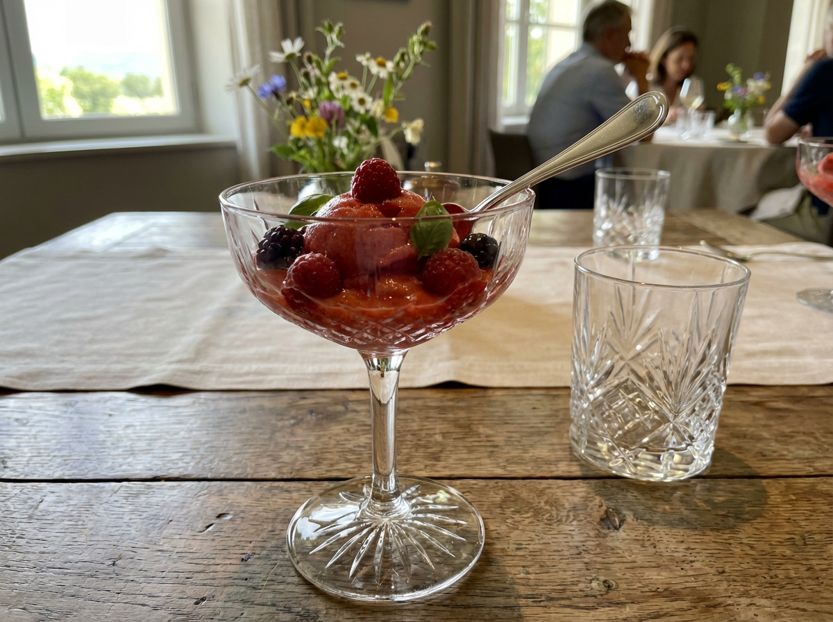 Fraises cueillies à pleine maturité chez M. Gianni : parfum ensoleillé, chair juteuse, intensité rare. Un sorbet d’une grande pureté, empreint du terroir et du geste du producteur.