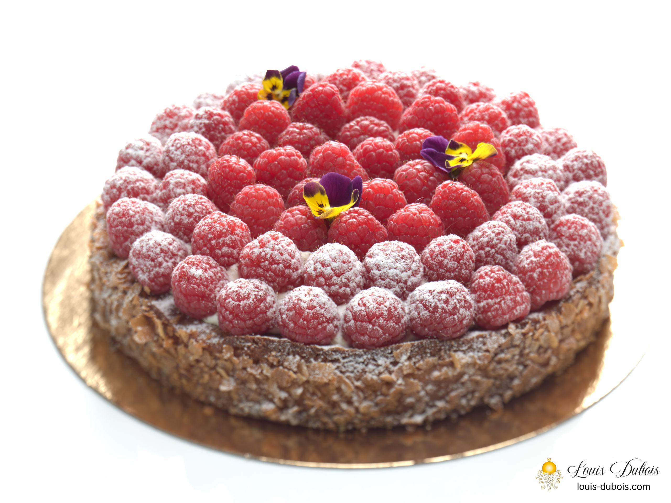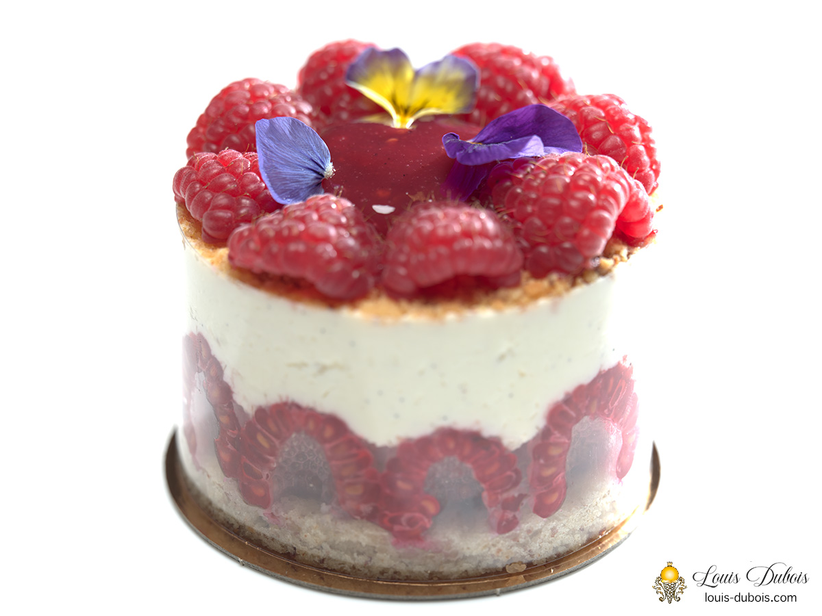 Dacquoise Amande, mousse vanille de Madagascar, confit de Framboise, crumble amande et fleur de sel