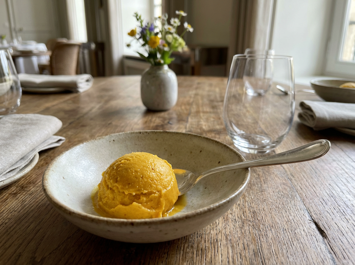 Mangues Kesar récoltées avec soin : chair dense, parfum solaire, profondeur aromatique. Un sorbet riche, pulpeux, vibrant, véritable hommage aux vergers indiens.