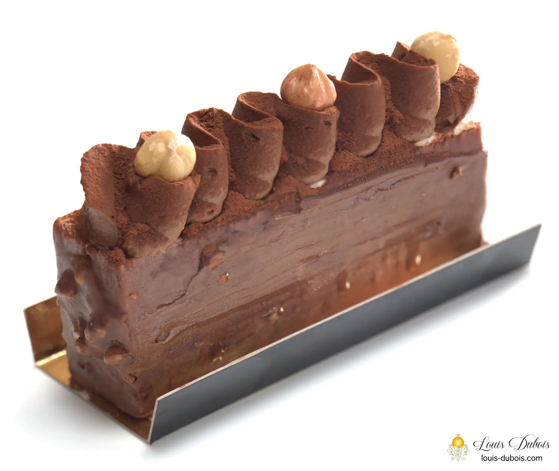 Biscuit acher Chocolat, croustillant praliné maison, crémeux Noisette du Piémont, mousse chocolat Blanc et chantilly, chocolat Noir 73%, fine coque de chocolat Lait aux éclats de Noisettes