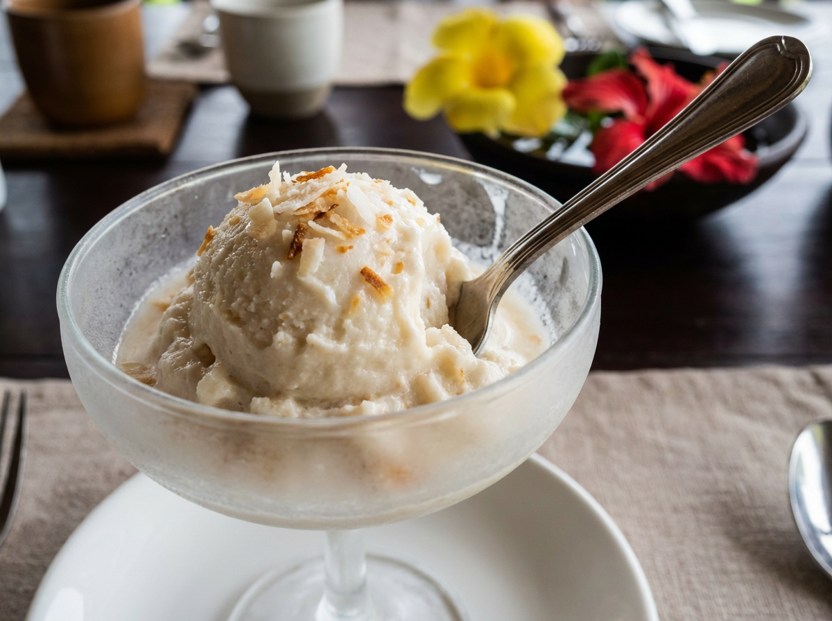 Un sorbet rafraîchissant préparé à partir de noix de coco mûres, typiques des régions tropicales du Sri Lanka. Sa texture légère met en valeur la douceur naturelle de la coco, offrant une sensation fraîche et douce, idéale pour accompagner un dessert ou être dégustée seule.