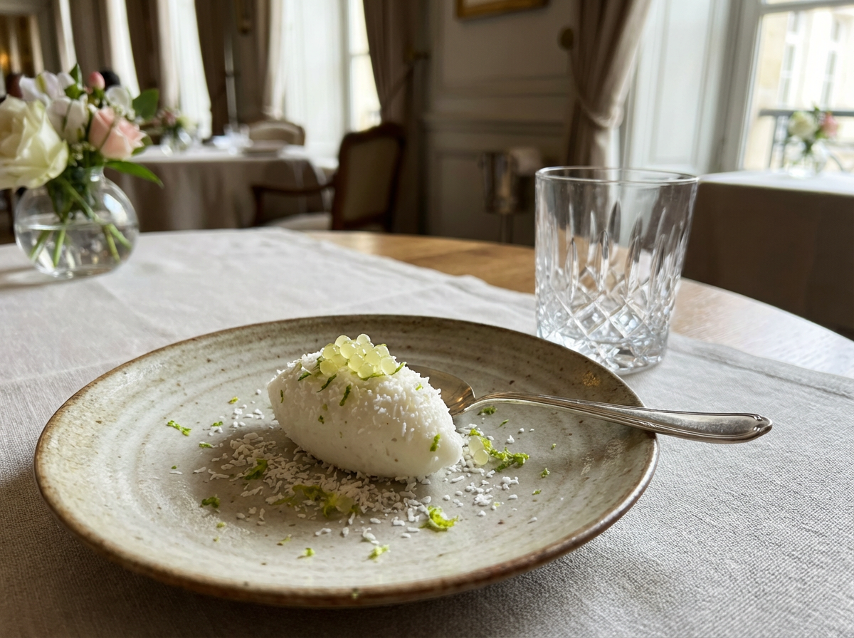 Coco douce et ronde illuminée par un combava vibrant, aromatique, presque électrique. Un sorbet expressif, singulier.
