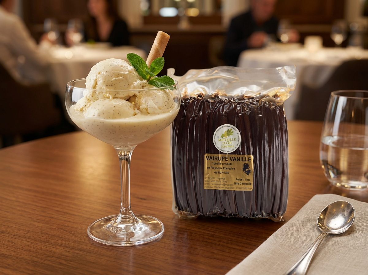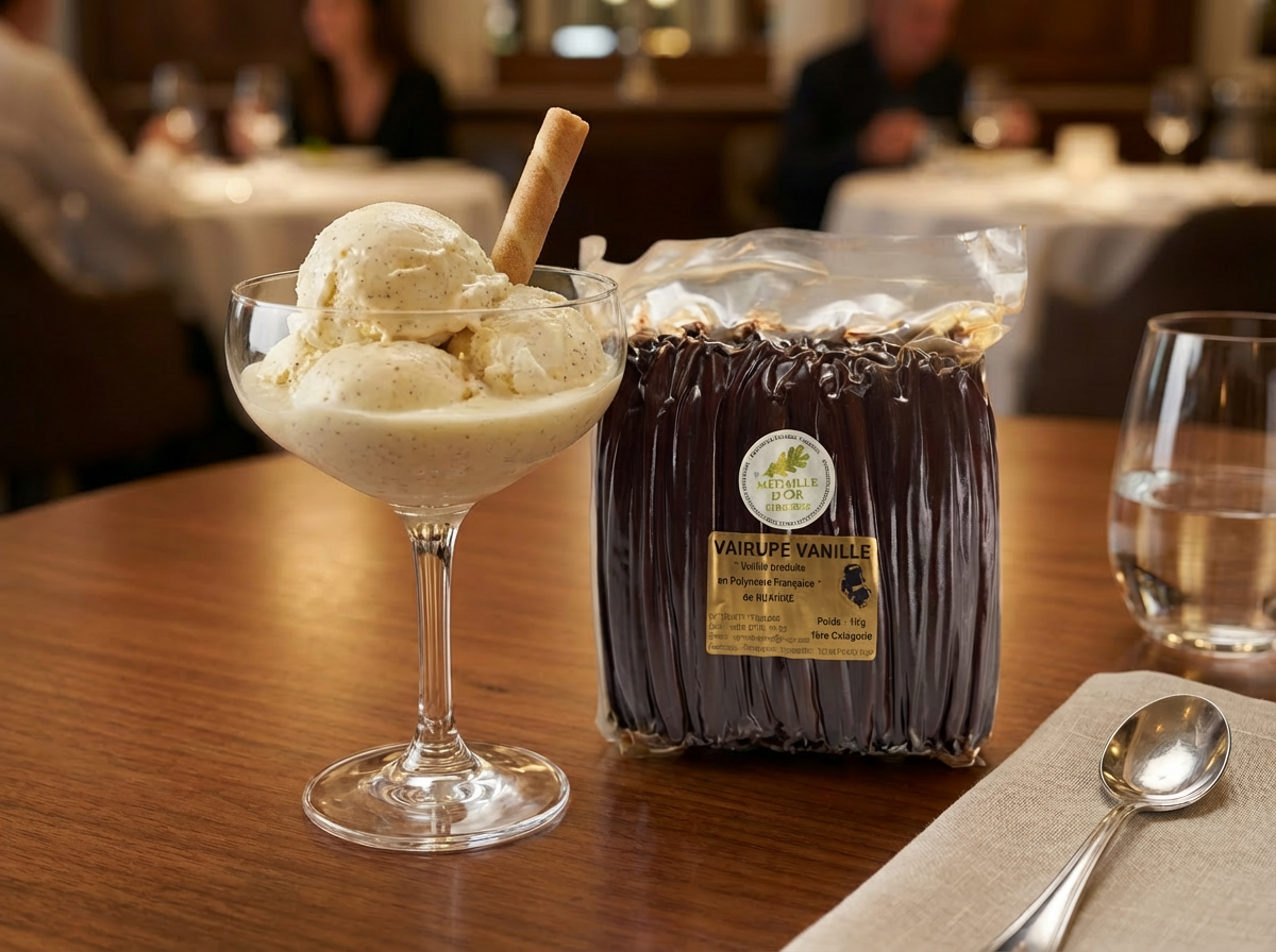 Une glace d’une élégance rare où la Vanille Tahiti VAIRUPE dévoile son intensité florale et sa douceur profonde. Texture somptueuse, arômes longs et enveloppants : une signature d’excellence, couronnée au Concours Général Agricole.